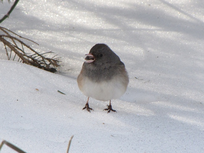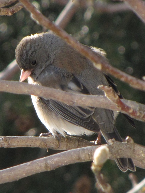 Bright moonlight tonight……will bring familiar nocturnal migrants like this Dark-eyed Junco to your garden, feeding station, or other favorite birding place by morning.