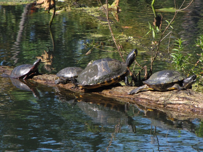 Invasive populations of Red-eared Sliders (right) continue to grow and threaten numbers of native freshwater testudines including the Painted Turtles seen here to the left. Introduced primarily as unwanted pets, sliders are now freely reproducing throughout much of the lower Susquehanna watershed. Their ability to feed aggressively and grow to sizes significantly larger than those of our most-imperiled wetland species including the Spotted Turtle (Clemmys guttata) and endangered Bog Turtle make them a menace rivaling habitat loss and illegal collecting.