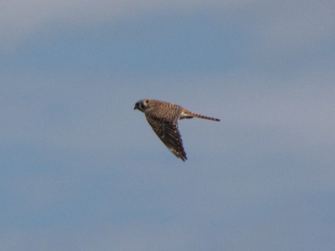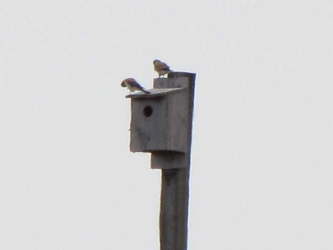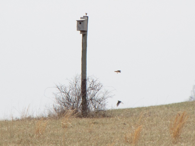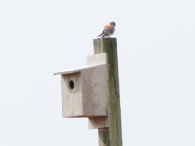 Within the past week, we noticed that kestrels are still competing for nesting sites and territory, driving away unwanted trespassers.  A pair of kestrels seemed to be occupying each of the four box sites we observed.  That’s good news, but the presence of these man-made nest cavities is in no way wholly responsible for this positive response from these declining birds.  It’s a matter of habitat, much needed grassland habitat.