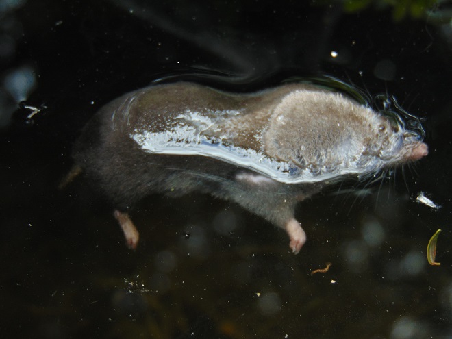 Other small vegetation-eating rodents including mice and voles thrive in managed grasslands.  Similar in appearance are the shrews.  Though seldom noticed, Northern Short-tailed Shrews spend day and night foraging for food, even in the shallow waters of wet meadows.  Unlike the aforementioned rodents, shrews are insectivores, secondary consumers feeding mostly on primary consumers including a variety of insects and other arthropods.
