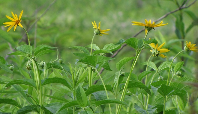 Greening up a week or two after the burn, Wingstem is blooming by June in areas treated using prescribed fire earlier in the spring.