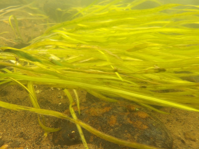 A mat of American Eelgrass growing in the flowing waters of the Susquehanna below Conewago Falls.  Eelgrass and other submerged aquatic plants consume nutrients deposited in the cobble, gravel, and sand substrate of the river’s pools.  Excess quantities of smaller particles of silt and clay can clog the substrate and thus inhibit the hyporheic exchange of water between the stream channel and the underlying aquifer, often diminishing the biomass and diversity of organisms inhabiting this benthic habitat.  Buried in these life-choking sediments, the river bottom becomes inhospitable to growth of submerged aquatics including eelgrass.