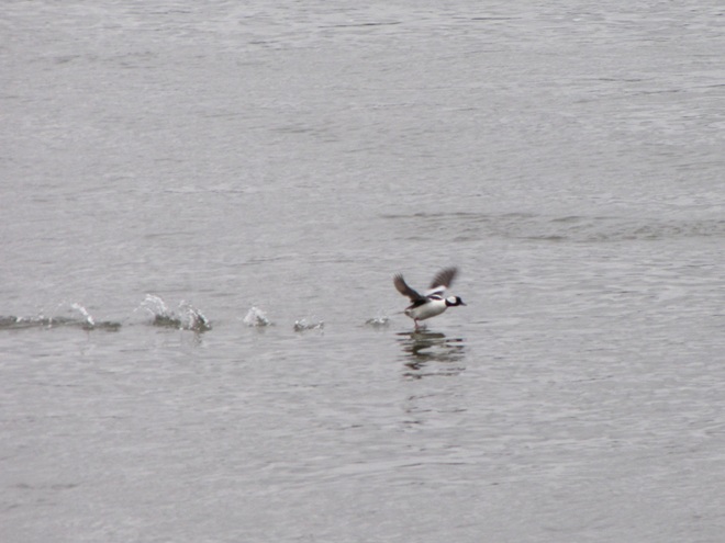 The presence of ice forces Buffleheads and other diving ducks to gather in turbulent open water, often below a riffle or dam.  Another alternative is to continue on toward the salty bays and estuaries of the coast.  High water may push these birds into the shallows among the flooded woods to feed, but they seldom utilize heavily forested riparian wetlands as a refuge due to their need for a running start to get airborne.