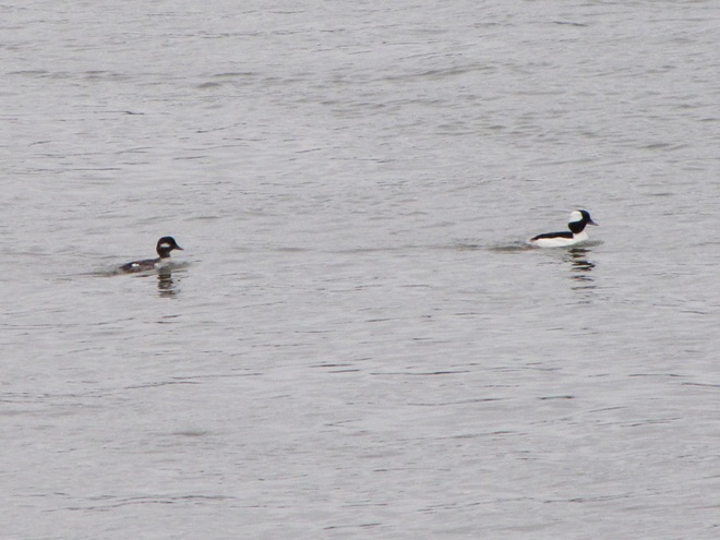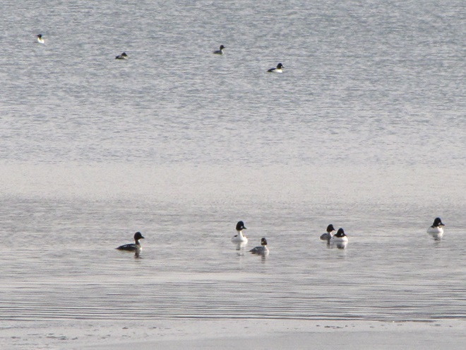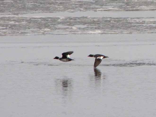 Common Goldeneyes on a patch of open water on an otherwise ice-covered “Lake Clark”, the impoundment created by Safe Harbor Dam.  While they may find this spot advantageous for loafing, the food supply over the sediment-layered substrate will be limited.