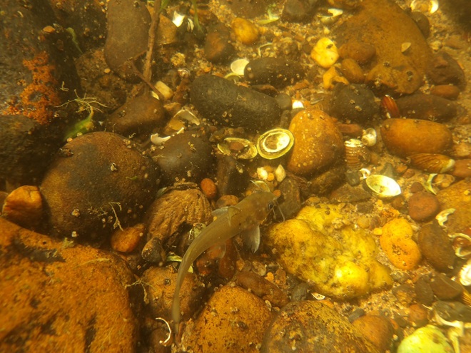 Benthic substrates in lotic freshwater pools and riffles support an abundance of life forms ranging from colorful diatoms on rocks and cobble, to invertebrates including snails and insect larvae, to fishes like this young Channel Catfish.  Free of accumulations of sediment, this river bottom not only provides habitat for a healthy fishery, it facilitates the bidirectional exchange of water between the Susquehanna and its underlying aquifer.
