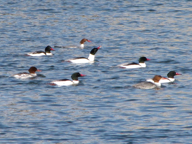 Common Mergansers will feed where benthic substrate supports the small fish and invertebrates they prefer. They will, however, gather in extraordinary numbers on the “lakes” created by riverine dams.  Though they can only feed on what floats in with the current, hundreds or sometimes thousands of Common Mergansers will concentrate on “Conowingo Pond” during the late fall or early winter.  There, safety in numbers gives them some guarantee of protection against the multitudes of eagles that simultaneously frequent the vicinity.  Another advantage of staging on “Conowingo Pond” is its close proximity to favorable feeding areas on upper Chesapeake Bay and stretches of the Susquehanna where lotic riffles and pools offer abundant opportunities below the river’s dams.
