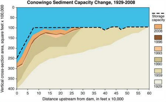 By the end of the twentieth century, accumulations of polluted sediments behind lower Susquehanna dams were nearing capacity.  There is no working plan to attenuate the massive release of these pollutants that may be triggered by a catastrophic flood.  The effort to reduce nutrient and sediment runoff remains the focus so that new loading is kept to a minimum and won’t add to the capacity problems at the dams, nor will it continue on to the Chesapeake at full strength when the dams are full.  Alleviating the sediment aggregation problem within the river’s impoundments is tall order and a dilemma not easily solved.  (United States Geological Survey image)