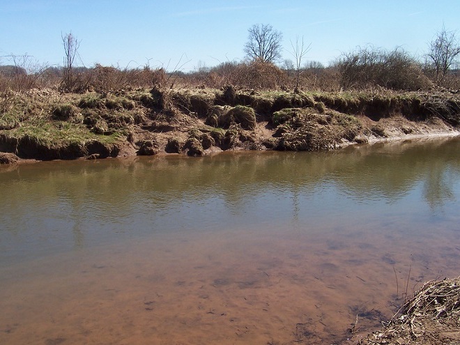 A channelized stream eroding a path through deposits of legacy sediments displaces flood waters into previously unaffected areas and provides a continuing source of nutrient and sediment pollution during storm events.