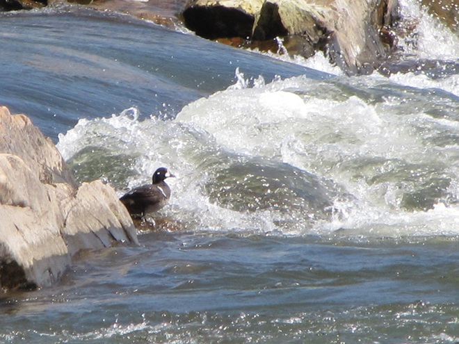 The Harlequin Duck winters along the rocky shores and man-made jetties of the Atlantic coast.  In summer, they nest on fast-moving, headwater streams well to our north.  Very rare on the Susquehanna, this is the first of two individuals found during March and April of 2025.  It was observed feeding in the swift waters of the high-gradient riffles and pools where the river cuts through Blue Mountain north of Harrisburg.  During previous weeks, Harlequin Ducks were being seen along the coast as far south as the mouth of the Chesapeake at Cape Charles, Virginia.  It’s very possible that some of these birds traveled north through the bay area and up the Susquehanna on their way north.