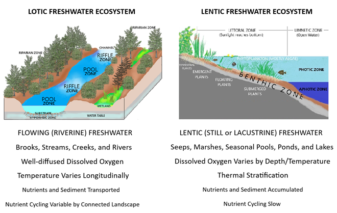 Some comparative attributes of unspoiled lotic vs. lentic freshwater ecosystems.  Low-gradient (slow-moving) lotic waters often create, and remain connected to, accompanying riverine wetlands (a lentic freshwater ecosystem).  These swamps, marshes, and ditches absorb, purify, and infiltrate flood waters while supporting a diverse number of plant and animal species.