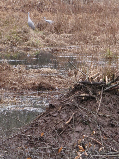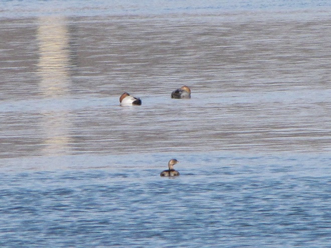 A Pied-billed Grebe and a pair of Canvasbacks on an ice-free stretch of the lower Susquehanna in mid-winter feed and loaf in a riffle-flanked pool where a large mat of American Eelgrass, a submerged aquatic plant also known as Tapegrass or Wild Celery, grows during the summer.  The complex layout of riffles and pools in a river this size offers tremendous opportunities for a diverse array a species to find their niche wherein they can survive and flourish.