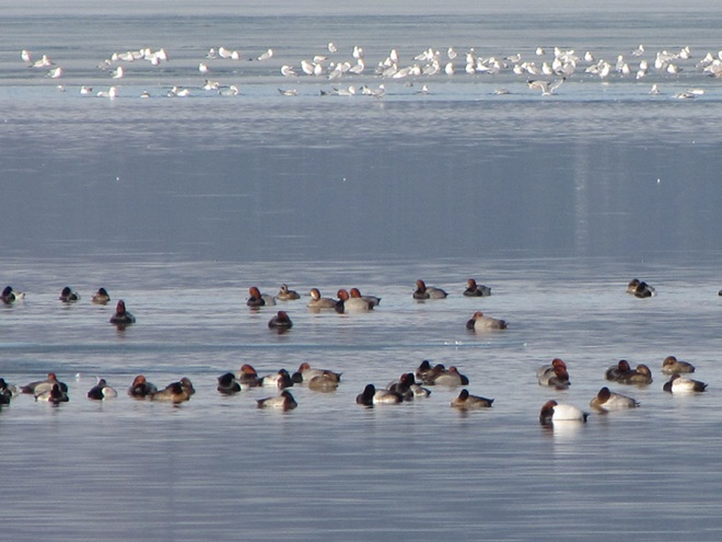 While the recovery of eelgrass/wild celery beds on the Susquehanna is trivial in scale and offers little support for numbers of waterfowl to return to historic levels, restorations on the upper Chesapeake in the vicinity of the Susquehanna Flats between Havre de Grace and Aberdeen Proving Grounds may have helped refuel a gathering of mostly Aythya genus ducks during the final days of February.  This mass of ducks, many of which were forced south from the frozen Great Lakes during the previous weeks (some by way of the ice-choked Susquehanna) were apparently making an abrupt turn to make their way back north.  Their stay was brief, but estimates by local birders put their numbers as high as one half million.  The vast majority of the concentration consisted of Aythya species: Redheads, Canvasbacks, Ring-necked Ducks, and both Lesser and Greater Scaup.  It probably included a mix of birds including both northbound migrants from further down the coast and the aforementioned refugees that had just arrived to pay a quick visit while escaping the late-season ice before turning around.