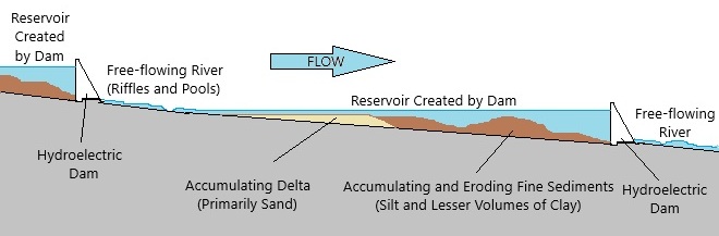 The construction of dams on the lower Susquehanna has converted vast mileage of the river from a lotic freshwater system into a series of man-made lentic freshwater lakes.  These areas have lost their function as a lotic transfer zone and are now a sort of dysfunctional series of depositional zones collecting vast volumes of sediment containing nutrients and other pollutants.  Within each impoundment, the reduced velocity of the river causes it to drop suspended sand first, then the finer particles of silt and clay closer to the dam.  The flow regime of riffles and pools is lost and the hyporheic zone that exchanges water between the river and the underlying aquifer is clogged.  These impaired segments of river become ripe for eutrophication: algal blooms followed by die offs that can lead to a fatal reduction of dissolved oxygen in the water column.
