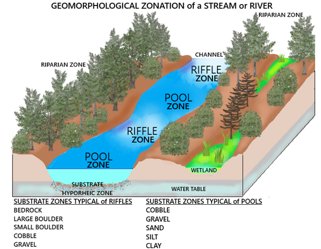 Riffle and Pool Characteristics of High Gradient (A) and Low Gradient (B) Streams.  This graphic illustrates the change in deposition characteristics of a stream or river as its gradient decreases.  A high-gradient stream (A) has a rapid velocity, often forms falls, and tends to carry away a high volume of all but the largest of particles of potential substrates as they erode from the surrounding landscape.  On a low-gradient stream, the loss in water velocity reduces the water column’s ability to transport even the smallest of substrate particles.  Deposition of this gravel, sand, silt, and clay forms lateral bars that over time create the familiar meandering path of a naturally flowing lowland stream.  (National Park Service image)