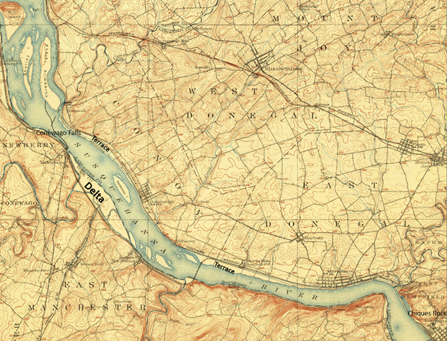 Although the present-day lower Susquehanna is largely a transfer zone, some deposition occurs along low-gradient segments of the river, particularly where its course parallels the watershed’s ridges both above and below the high-gradient rapids where its path continues to erode passage through the bedrock.  On this 1908 map of the Susquehanna at Conewago Falls, alluvial terraces of gravel, sand, silt, and clay can readily been seen as pale areas nearly lacking brown contour lines along the shorelines and islands of the river.  Deposits within most of these terraces date back to the melt period following the most recent glacial event and beyond.  The delta shown at the mouth of Conewago Creek (west) includes massive volumes of material deposited by both the creek and the river.  This delta is currently known as Brunner Island, much of it developed as the site of a coal/gas-fired electric generating station.  Terrace deposits along the Susquehanna’s shorelines created extensive perched marshes and swamps (wooded marshes) fed by rains, high river water, small streams, and springs, the latter often seeping from the base of the rocky escarpments carved by the ancient Susquehanna and defining the present-day inland border of the floodplain.  We call these sites “Alluvial Terrace Wetlands”.  Few of these critical components of river morphology survive.  Those not drained for farmland were obliterated by urbanization and canal, railroad, and highway construction.  (United States Geological Survey base image: Middletown, PA, quadrangle, 1908)