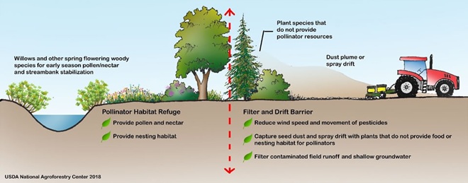 To sequester sediment and cycle nutrients contained in runoff, the U.S.D.A. recommends installing riparian buffers between streams and lands used for grazing and raising crops.  To protect pollinating species including bees and butterflies from pesticide drift and runoff, they further recommend installing a stand of wind-pollinating plants such as conifers, oaks, and birches between the field and streamside plantings.  These same practices improve water quality and wildlife habitat on waterways located in residential and commercial areas as well.  (United States Department of Agriculture image)