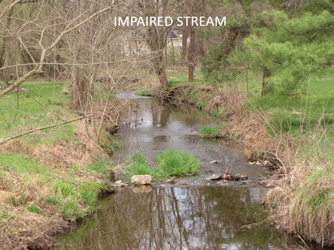 Here’s a polluted pasture stream with grazing livestock defecating where access to water is gained at a broken down embankment of nutrient-loaded legacy sediments left behind at an abandoned mill pond site.  It’s a reminder that all it takes is just one stubborn jackass to foul up the whole waterway.