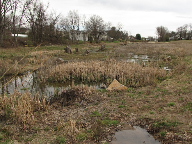 This legacy sediment removal project restored the same creek to a braided meandering path while also reconnecting it to its historic floodplain.  In just their second year, the wetlands are effectively absorbing stormwater and sequestering nutrients as an attached component of the riffle and pool complex.  During our visit earlier this week, we found American Toads, Northern Leopard Frogs (Lithobates pipiens), and Northern Spring Peepers breeding there!