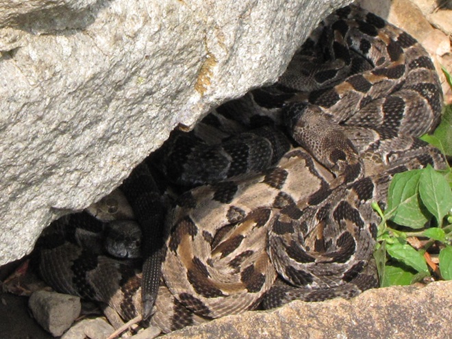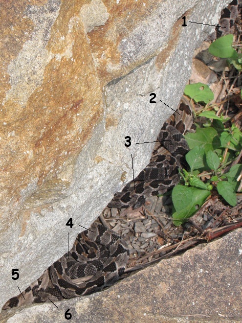 An adult Eastern Copperhead (Agkistrodon contortix). (Fred Wilcox image)Adult Eastern Copperheads (Agkistrodon contortix) outside a birthing den.Closeup of an adult Eastern Copperhead (Agkistrodon contortix) outside its birthing den.An adult Eastern Copperhead (Agkistrodon contortix) outside its birthing den.A juvenile Eastern Copperhead (Agkistrodon contortix) outside a birthing den.A juvenile Eastern Copperhead (Agkistrodon contortix) displaying the yellow tip of its tail, a lure used to attract potential prey including small insects.A female yellow-phase Timber Rattlesnake (Crotalus horridus) at its birthing den.Close-up view of a Timber Rattlesnake (Crotalus horridus) showing the facial pit in front of the eye and the vertical pupil, traits typical of pit vipers (Viperidae). Like copperheads, Timber Rattlesnakes are ovoviviparous: the female retains the fertilized eggs within her body. Then, after breaking free of the egg sac, the young are live born within the birthing den. The female’s brood of juvenile Timber Rattlesnakes (Crotalus horridus), less than one week old, clustered at the entrance to the birthing den. As they mature, the buttons on their tails will become the familiar rattles.After separating a bit to bask in the sun, at least six juvenile Timber Rattlesnakes (Crotalus horridus) could be enumerated in this brood. Note the variation in colors, which may or may not indicate their appearance (yellow, brown, or black) as adults. Timber Rattlesnakes (Crotalus horridus), an adult female with juveniles, outside a birthing den on September 1, 2011. (Fred Wilcox image)Juvenile Eastern Copperheads (Agkistrodon contortix) outside the same birthing den on September 24, 2011.